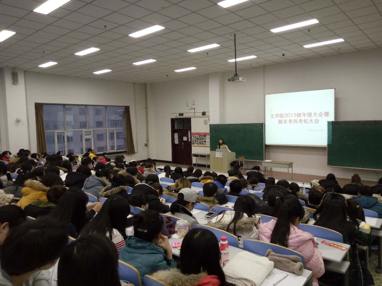 2015年12月15日下午15时40分,文学院2015级年级大会暨期末考风考纪大会在汇文楼280教室顺利举行。本次大会由文学院2015级辅导员贾雨薇老师主持,全体2015级学生参加了本次大会。